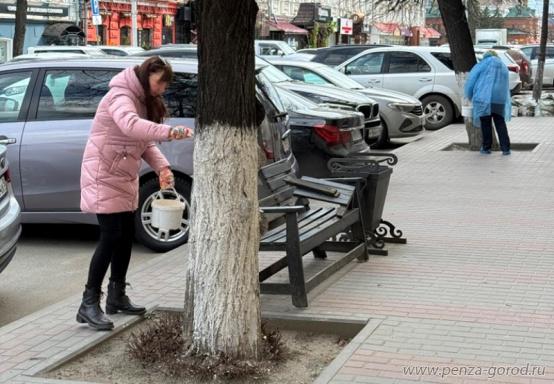В рамках месячника по благоустройству сотрудники администрации Железнодорожного района побелили деревья на четырёх улицах Пензы.