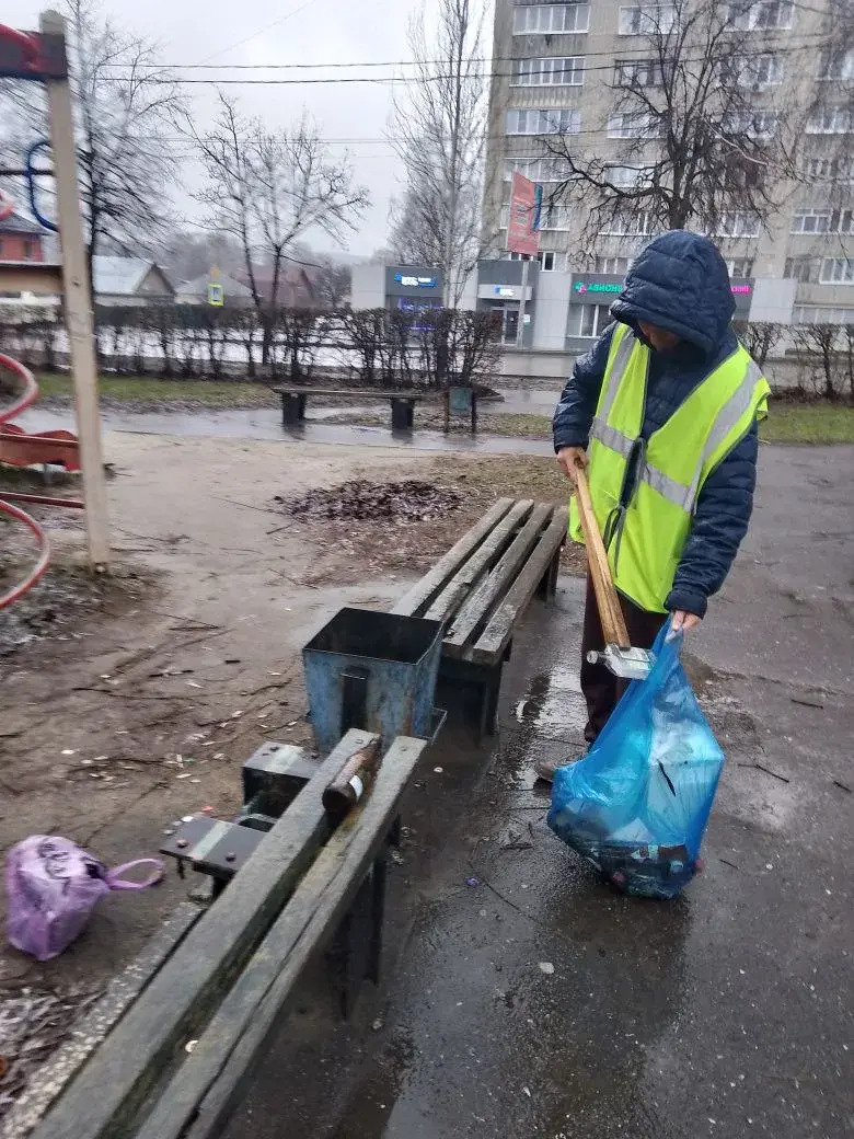 Специалисты муниципального предприятия наводят порядок на общественных пространствах, убирая мусор и подметая тротуары.